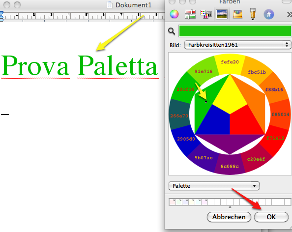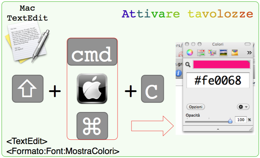 Nei sistemi Mac ci sono integrati delle tavolozze nel sistema. Si attivano automaticamente per determinate applicazioni (p.es. .graffle) e sono attivabili in ogni momento tramite l'applicazione <TextEdit> e i tasti ⇧⌘C.