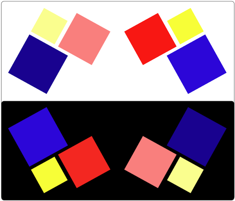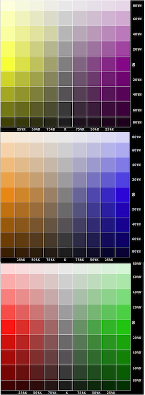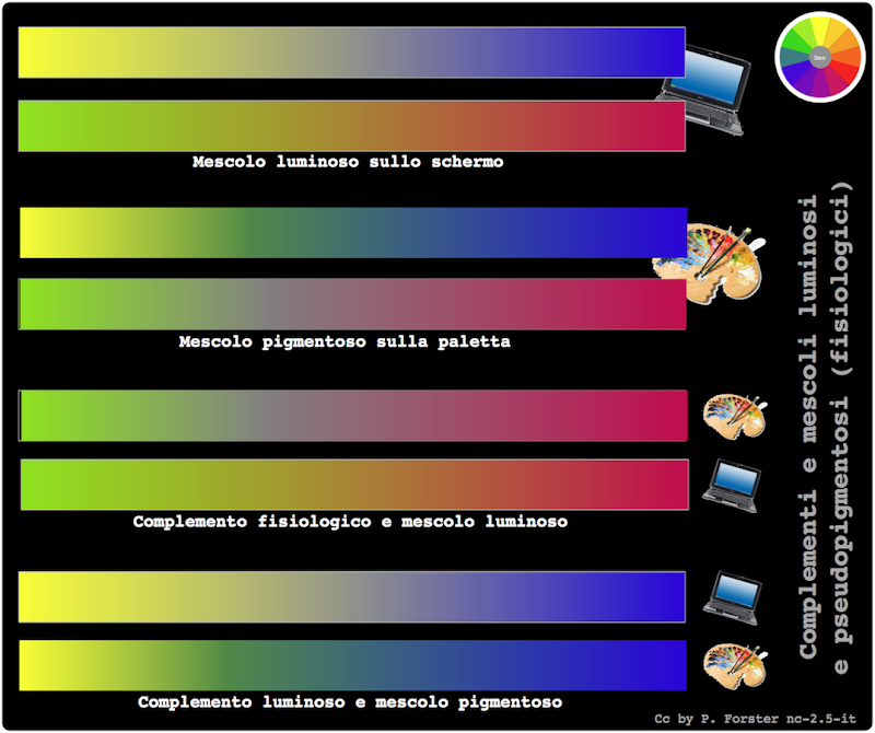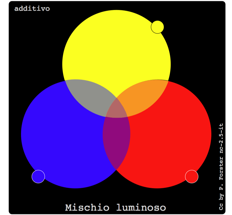![]() lum. → additivo p.es. #0000ff + #ffff00 = #808080 | ![]() fisio. → sottrativo p.es. #0000d1 & #fafe20 = #00b900 | ![]() pig. → pigmentoso p.es. #0000d1 ∩ #fafe20 = #3d7733 |