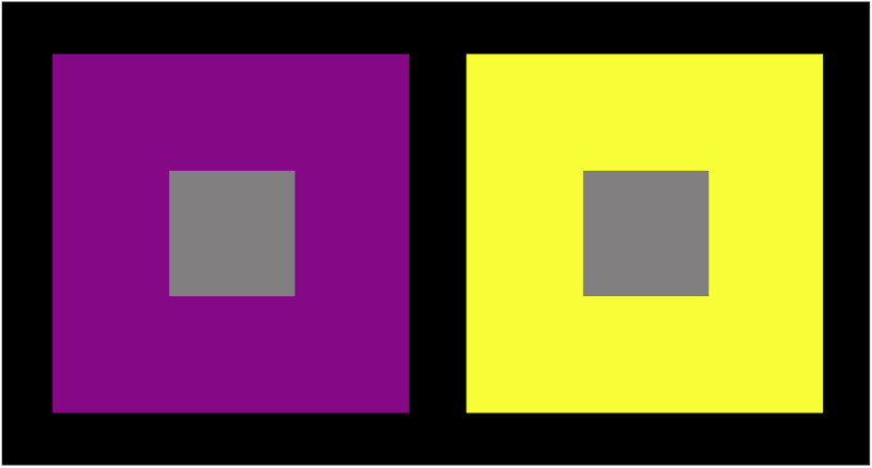 Mettendo un quadrato grigio su una superfice tinta, il grigio assume la sfumatura del complemento alla tinta. Si chiama contrasto simultaneo.