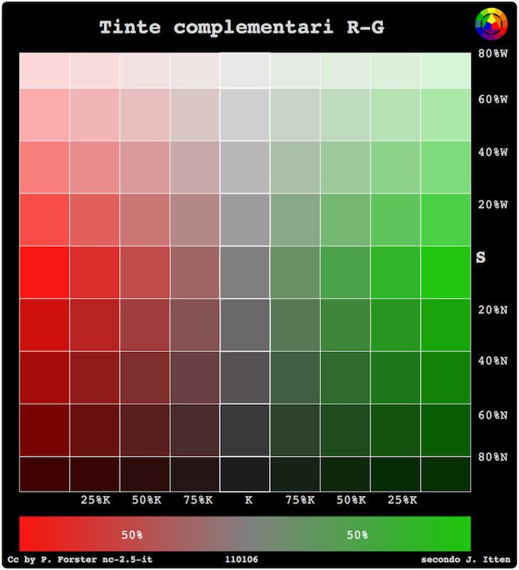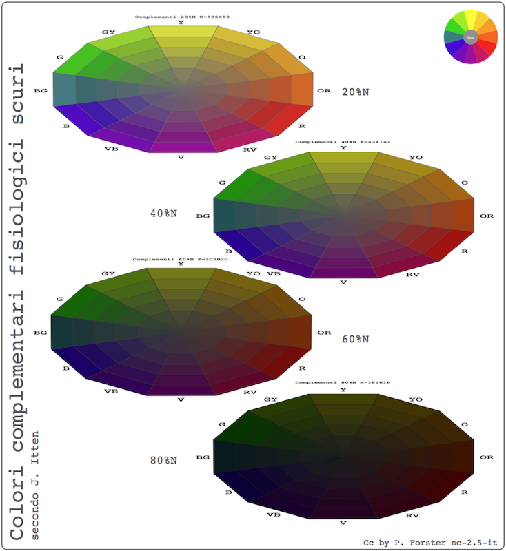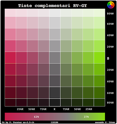 Il grigio complementare delle due è quello dei complementi saturi 6f6c6e in modo che abbiamo tre punti fissi per interpolazioni di saturazione, luminosità e ingrigiamento:
