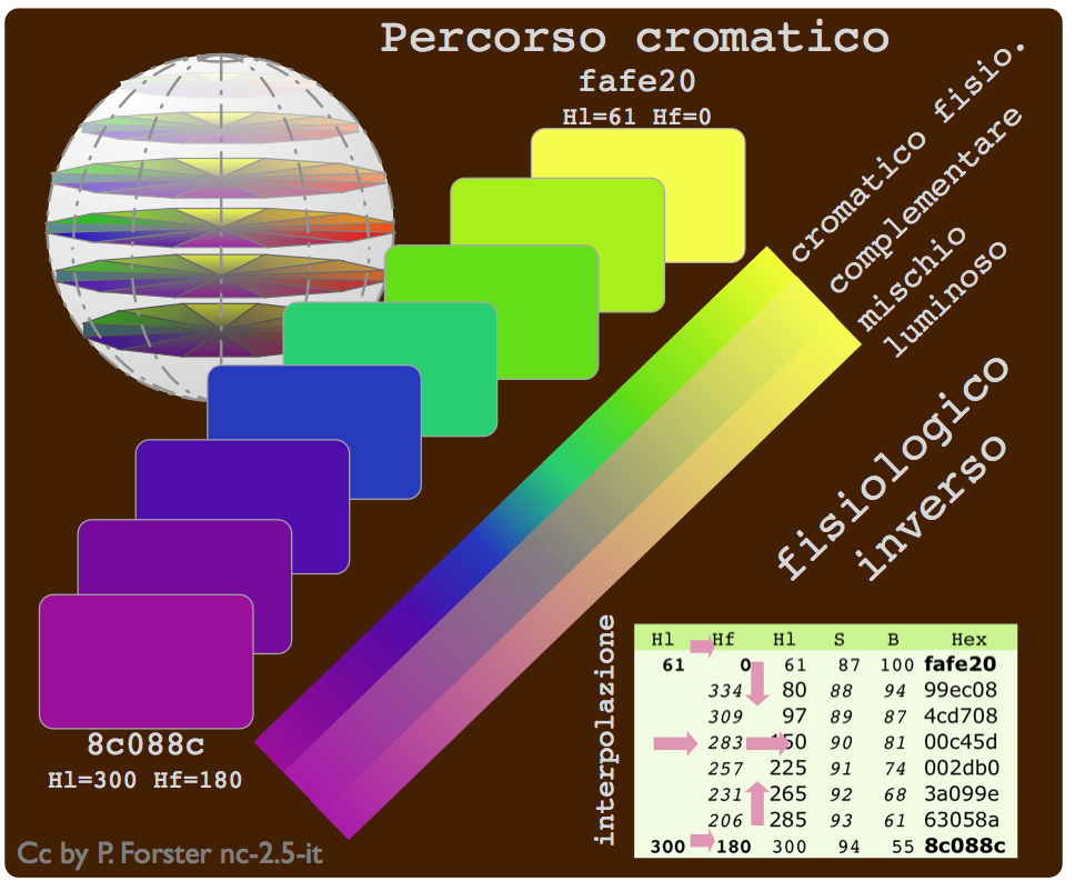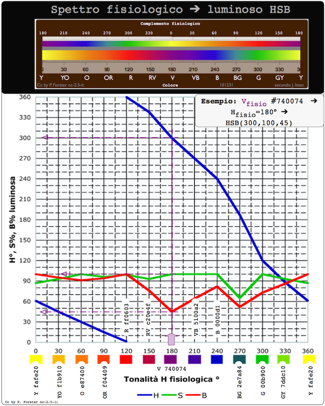 Si nota anche che il percorso fisiologico V-R-O-Y è all'incontrario alle convenzioni luminose che riportano V-B-G-Y (senso orario vs. senso antiorario). Chi intende a colcolarsi il percorso antiorario, faccia semplicemente l'interpolazione all'inverso.