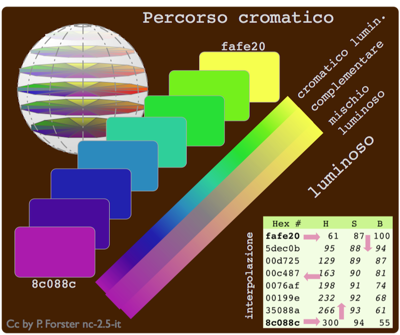 Ampliando la procedura di una dimensione, si riesce ad aprossimare dei percorsi tra qualsiasi colori contenuti nella sfera dei colori, eseguendo delle interpolazioni tra i tre parametri della notazione HSB (Hue, saturation, brightness) tonalità, saturazione e luminosità: descrivono abbatanza fedelmente i tre parametri della sfera: longitudine, latitudine e distanza dal perno. Il calcolo stesso è banale aritmetica e trasformazioni tra HexRGB e HSB. Senza entrare nel dettaglio, il grafico di fianco dovrebbe svelare agli interessati il "modo d'uso".