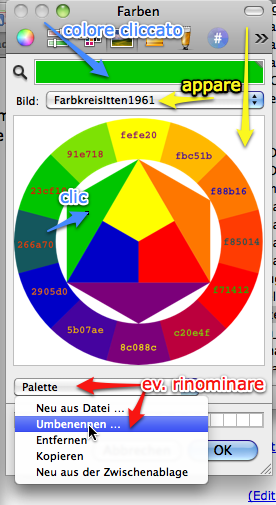 Bisogna disporre (fare) di una cartelle che contiene dei files immagini delle tavolozze da integrare. Ho preparato dei links di diverse tavolozze utili secondo Itten, le quali possono essere scaricate dal web. Personalmente li ho poi messi in una cartella "Tavolozze". Si tratta dei seguenti files: