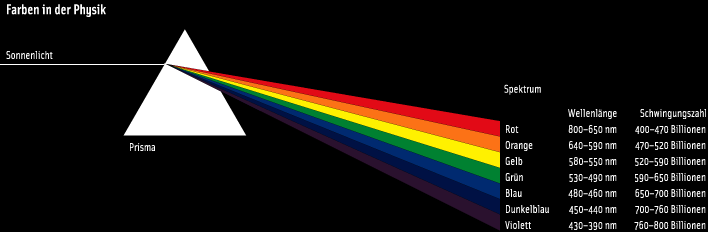 In fisica i colori si interpretano come vibrazioni elettromagnetiche. La luce solare viene decomposta tramite un prisma di vetro nei colori basilari dello spettro.