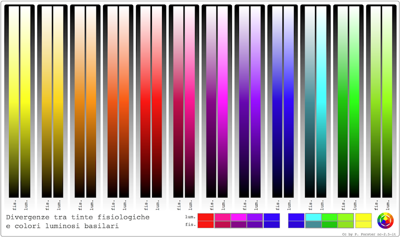 Le luminosità delle tinte sono diverse tra di loro come si può paragonare davanti un fondo di grigio neutrale: giallo puro è la tinta fisiologicamente più luminosa, viola la più scura.