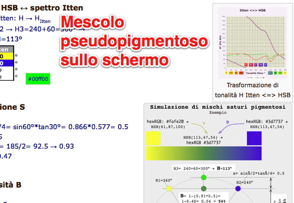 Quanto ho controllato con penello e paletta il risultato concreto del calcolo cui sopra ero soddisfatto di vedere dei colori corrispondenti - dei verdi - invece delle sfumature violastre e aranciastre di un mescolo luminoso. 8>)__