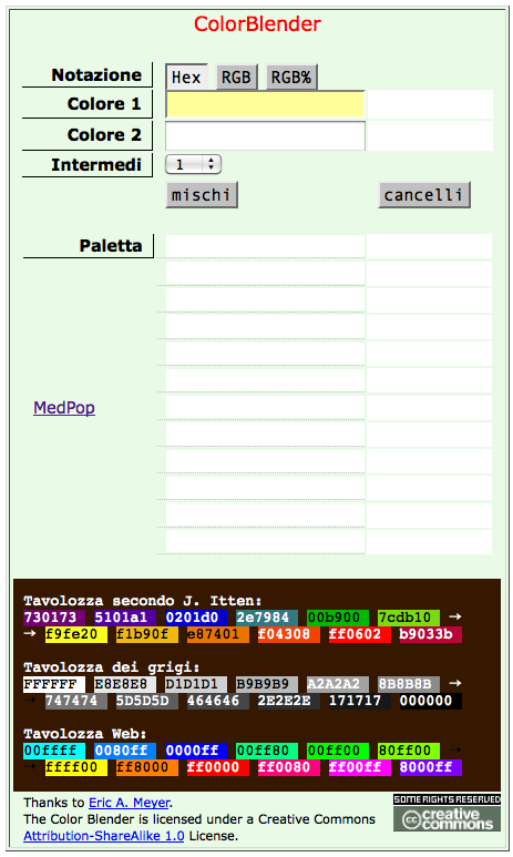 Il ColorBlender è lo strumento per fare delle interpolazioni tra colori luminosi concepito da Eric A. Meyer e adattato per le nostre esigenze.