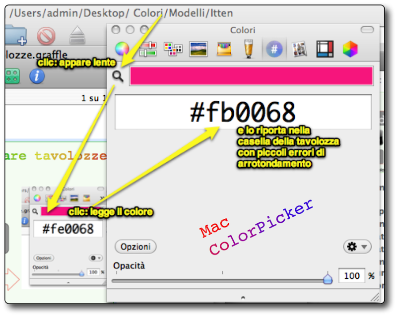 Nelle tavolozze di sistema Mac è integrato un ColorPicker: cliccando sul simbolo "lente" appare una lente al posto del puntatore. Muovendolo sopra lo schermo si può scegliere un determinato colore cliccando su di esso. Il numero corrispondente appare nella casella della tavolozza e se era prescelto una parte di testo modifica il testo nel colore. Altrimenti si può copiare il numero e incollarlo ovunque.