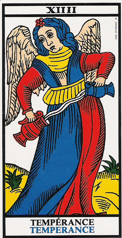 XIV - La Temperanza (La Temperance). Altra virtù cardinale. Un Angelo con la veste bipartita in due zone di colore blu e rosso, versa un liquido da un'anfora all'altra reggendole entrambe con le mani.
