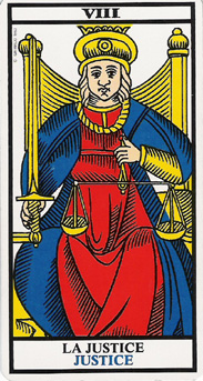 VIII - La Giustizia (la Justice). È questa una delle tre Virtù cardinali citate nel mazzo, da cui manca la Prudenza. Una donna in trono regge con la mano sinistra una bilancia dai piatti allineati, e con la destra una spada. Questo Trionfo contiene in sé l'idea di equilibrio e di punizione.