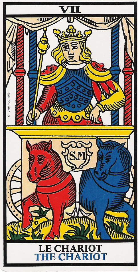 VII - Il Carro (Le Chariot). Un carro visto in modo rigidamente frontale, è condotto da un giovane guerriero incoronato, mentre trattiene saldamente due cavalli, uno blu ed uno rosso, che tendono a scartare in posizioni opposte.
